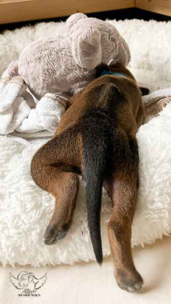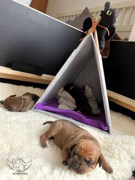 Mittlerweile verlassen sie die Wurfkiste selbstständig und tapsen neugierig durch ihr Welpenzimmer. Alles, was sie erreichen können, wird mit dem Mäulchen und den kleinen Zähnchen erkundet.